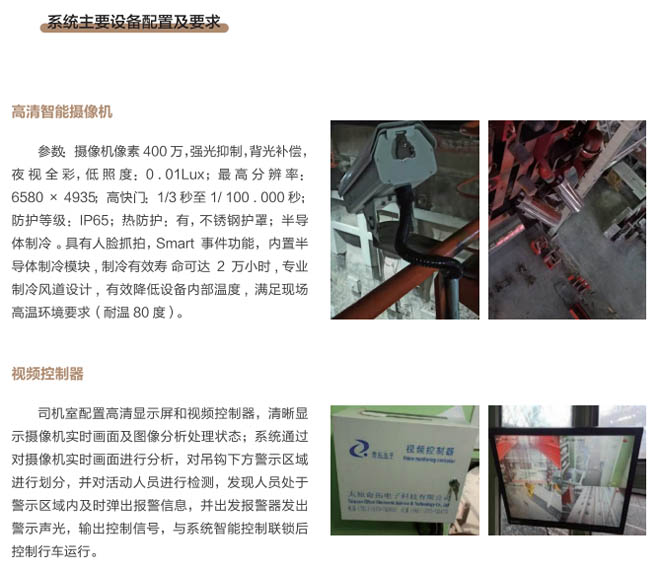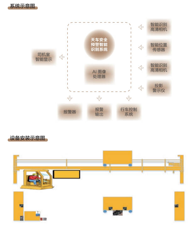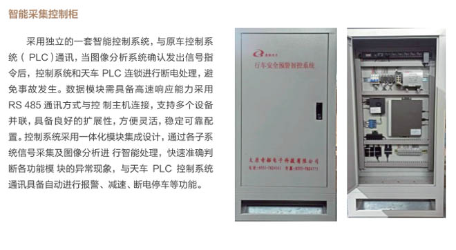 6、行車智控系統(tǒng):控制系統(tǒng)采用一體化模塊集成設(shè)計, 通過各子系統(tǒng)信號采集及圖像分析進 行智能處理,快速準確判斷各功能模 塊的異,F(xiàn)象,與主機PLC控制系統(tǒng) 通訊連接具備自動進行報警、減速、斷電停車等功能,當系統(tǒng)確認發(fā)出信號指令后,控制系統(tǒng)和行車PLC連鎖進行斷電處理,避免事故發(fā)生。