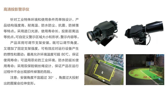 1、區(qū)域警示系統(tǒng):在行車小車底部增加一臺工業(yè)警示儀,投影到行車吊鉤下方6米范圍內(nèi)作為警戒區(qū)、4米范圍內(nèi)作為危險區(qū)(警示區(qū)域可自行設(shè)定區(qū)域范圍大小及圖像形狀和文字內(nèi)容)